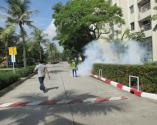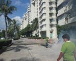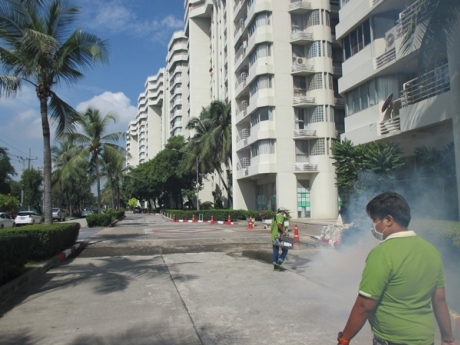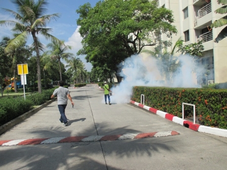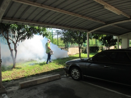 - ฉีดพ่นเคมีกำจัดลูกน้ำ (LARVICIDN) ตามแหล่งเพาะพันธ์ เช่น คู คลอง ที่มีน้ำขัง หรือท่อระบายน้ำรอบ ๆ อาคารสถานที่