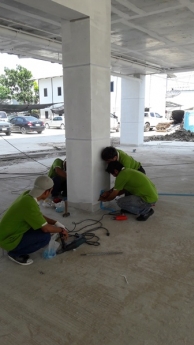 - ฉีดพ่นน้ำยาเคมีภายในและรอบนอก ตามรอยแยก รอยร้าว และจุดที่พบปัญหา หรือเจาะพื้นตามจุดสำคัญ เพื่ออัดน้ำยาเคมีลงดินป้องกันและจำกัดปลวกใต้พื้นอาคาร (ในการบริการครั้งแรก)